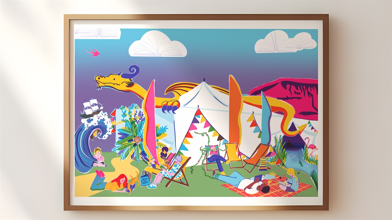 I wanted the programme cover to capture the idea of escapism through books, to show how opening the pages can transport you into a whole new world, and how that experience is different for everyone. Reading can be joyful, comforting, exciting or surprising, and I wanted the illustration to reflect that sense of imagination opening up.